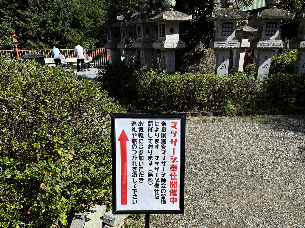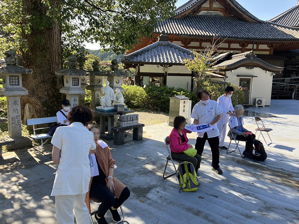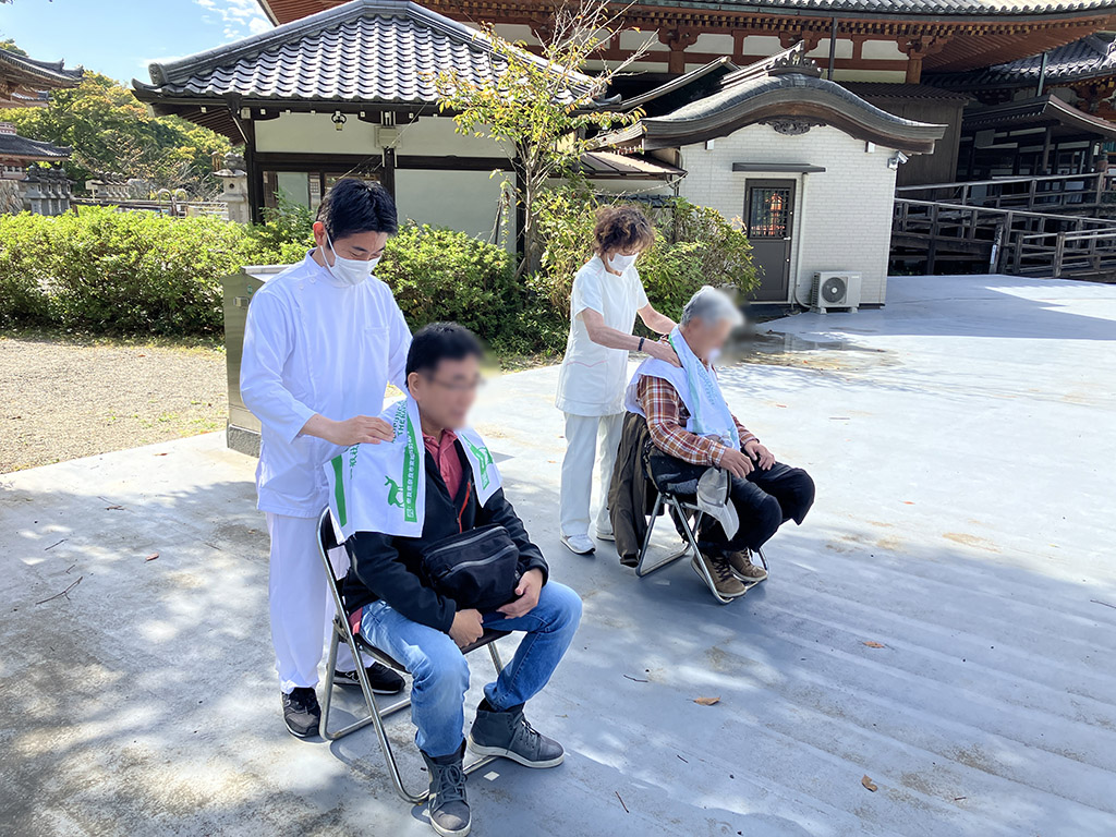 令和6年度 壷阪寺施術奉仕活動 日時令和6年10月20日(日) 10:30~14:30頃 場所壷阪寺(高取町) 内容マッサージ施術(座位にて1人15分程度)。 施術者7名で、55名の参拝者の施術を行った。 前日の雨で地面は濡れていましたが、暑くも寒くもない気持ちの良い快晴で、会話も弾み施術後は皆様に喜んで帰っていただきました。
