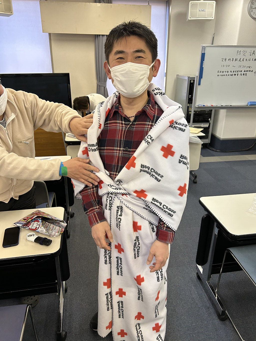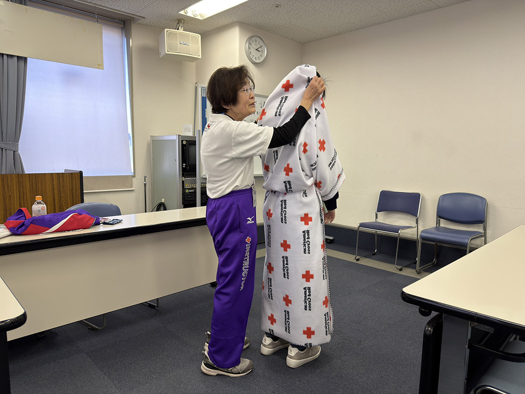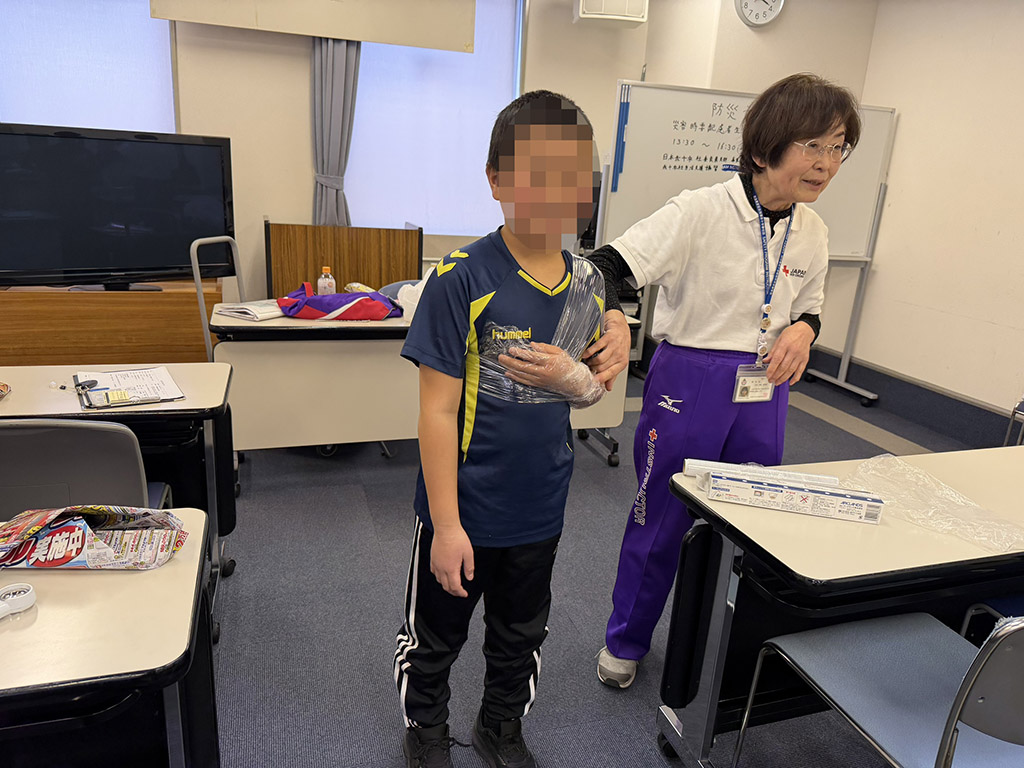 さらに、大災害時のライフライン途絶に備え、毛布や新聞紙、ペットボトルなど身近な物を使って低体温症を防ぐ方法や、限られた水で衛生を保つ工夫といった自助策についても実技を交えて教えていただきました。